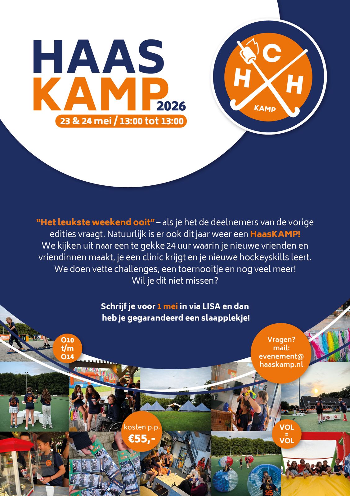 JA! Ook dit jaar wordt er weer een mega tof kamp voor de O10, O11, O12 en O14 georganiseerd! Dit jaar zal het kamp plaatsvinden van zaterdag 23 mei 13.00 uur t/m zondag 24 mei 13.00 uur, kosten €55 p.p. Wij kijken uit naar weer een té gekke 24 uur waarin je nieuwe vrienden/vriendinnen maakt, je toffe spellen, activiteiten en challenges gaat doen maar bovenal ook kunt werken aan je hockeyskills! De inschrijvingen zijn nú geopend via de Lisa app! Ben je klaar om er een onvergetelijk weekend van te maken?!